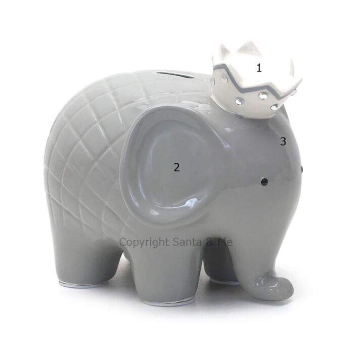 These Coco Elephant Banks are the perfect size for your child's bedroom. This adorable elephant coin bank not only saves, it will also add the perfect touch of cute to any child's room. Crafted with high quality ceramic and then sealed with a glaze.This is the perfect baby shower or christening gift that is sure to touch the hearts of any new or expecting parent. We hope the little ones will enjoy saving for many years to come.